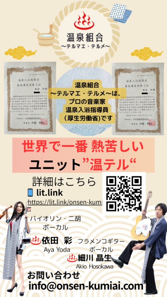 2026.4.17(金) 万座温泉 日進館 4/17(金) 20:00~ ロビーコンサート 無料! 温泉組合〜テルマエ・テルメ〜 (温テル) バイオリン・二胡・ボーカル 依田彩 フラメンコギター・ボーカル 細川晶生 万座温泉 日進館